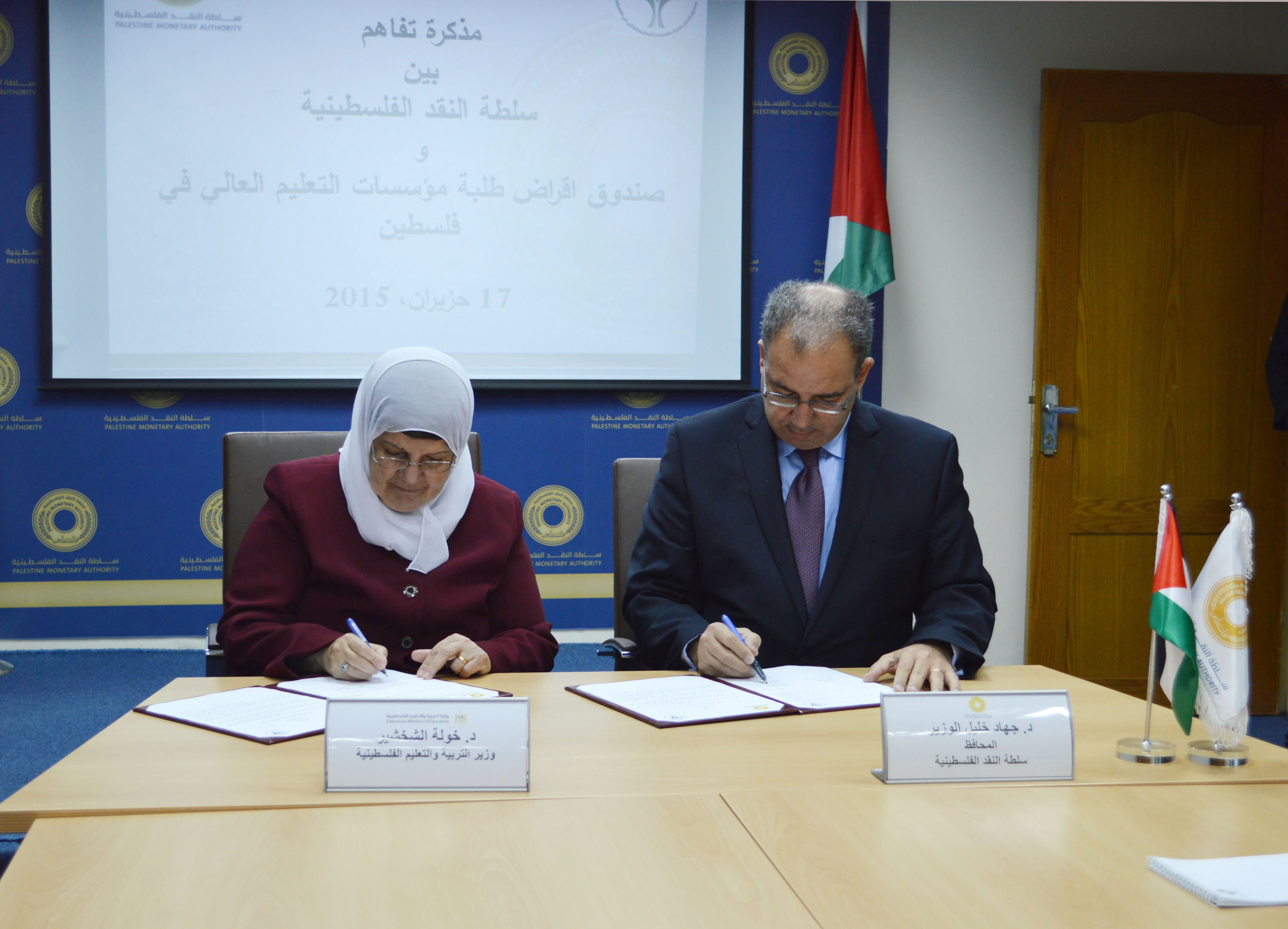 وقع محافظ سلطة النقد د. جهاد خليل الوزير ووزيرة التربية والتعليم العالي رئيس مجلس إدارة صندوق إقراض طلبة مؤسسات التعليم العالي في فلسطين أ.د. خولة الشخشير؛ مذكرة تفاهم تمنح سلطة النقد بموجبها الصندوق صلاحية الاستفادة من خدمة مكتب المعلومات الائتمانية على نظام الاستعلام الموحد.